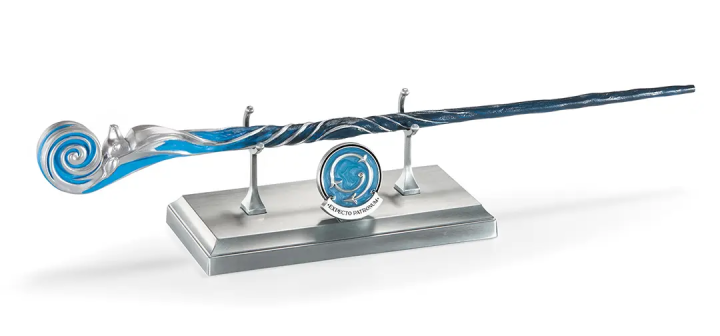 Inclusi nel set: il supporto in metallo die-cast per esporla, e una spilla decorativa con motivi che richiamano l’incantesimo del Patronus.